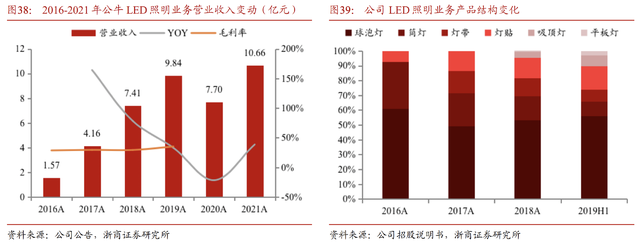 LED灯是一个高度分散且持续进行消费升级的行业,所以公牛的相应业务营收增长非常迅猛,传统球泡灯在LED业务中的营收占比越来越低,高毛利消费升级产品的占比正逐年提高。
