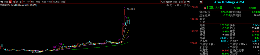 (2)美股ARM已经三天翻倍。要知道,这是一家超过千亿美元市值的科技巨头,不是什么微盘股。三天取得最高超过翻倍涨幅,短期业绩与交易因素并不足以完全解释,背后AI产业因素更为关键。公司预计未来各类终端(手机、PC、汽车与机器人)都会加入AI,IP内核授权商业模式似乎更适合未来碎片化的AI终端格局。