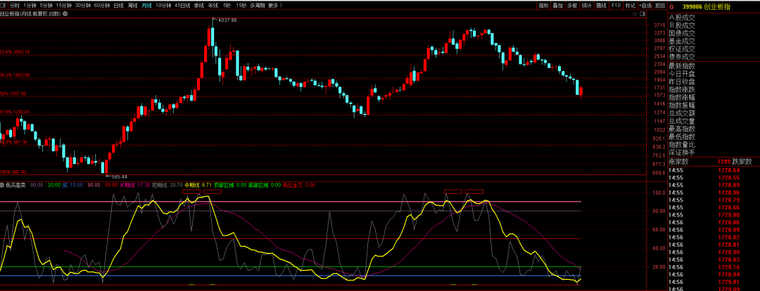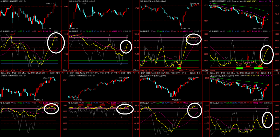 下图上排依次是创业板指的5分钟图、15分钟图、60分钟图、日线图。