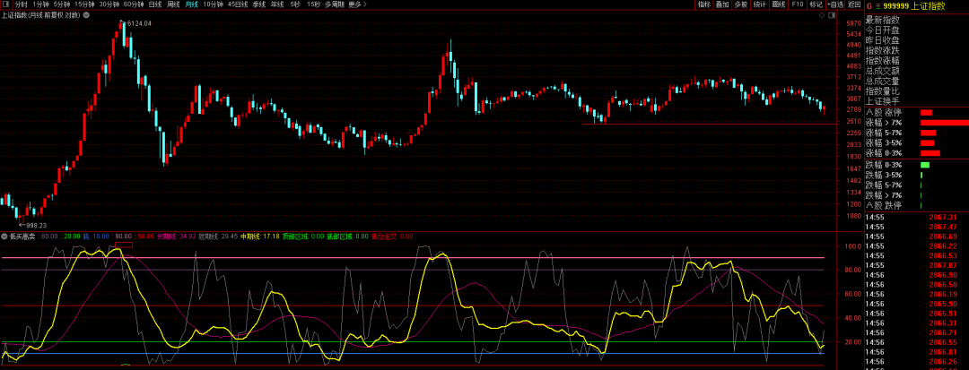 下图下排依次是上证指数的5分钟图、15分钟图、60分钟图、日线图。