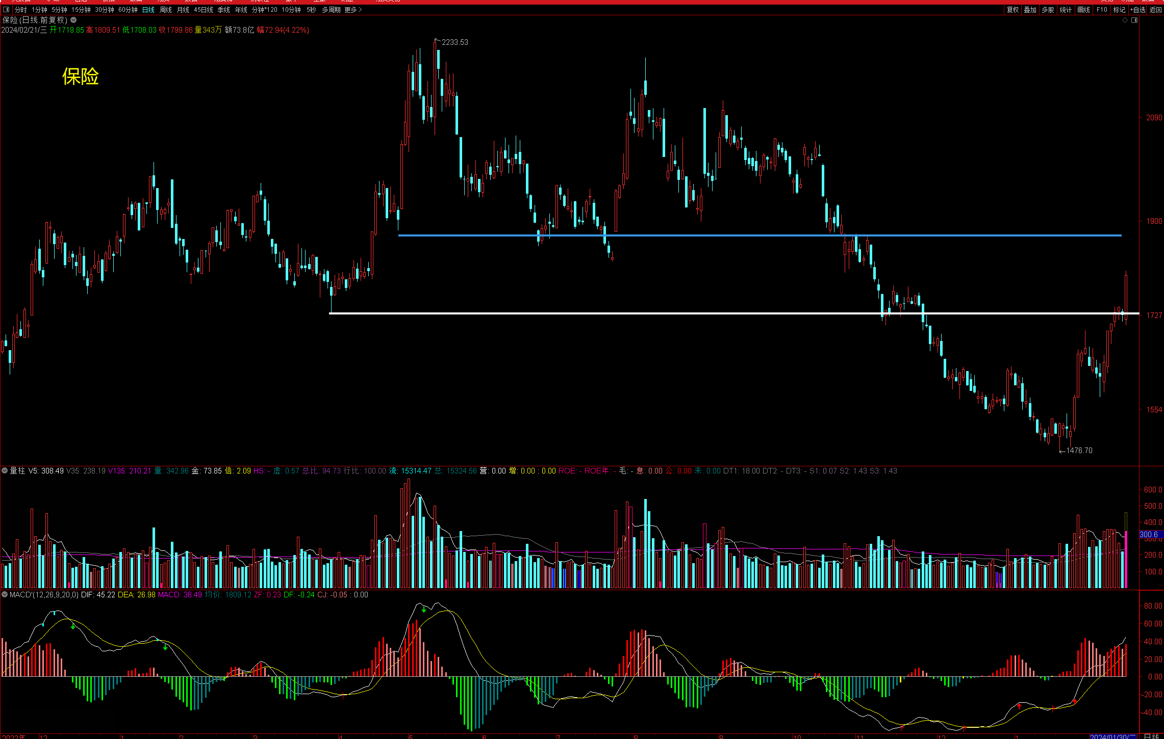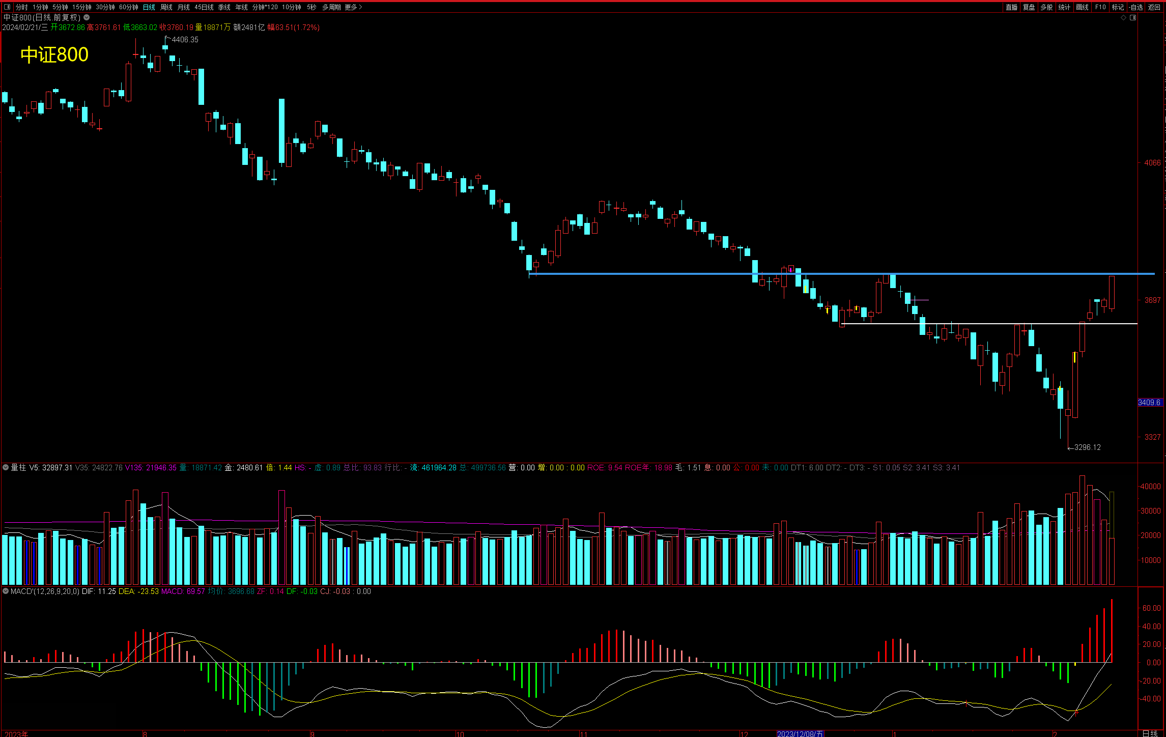 白线处是个短线的多空分水岭,三天站稳后今天再度放量大涨,尝试冲击蓝线处压力。从当前市场氛围及政策导向来看,这一波冲过去的可能较大。