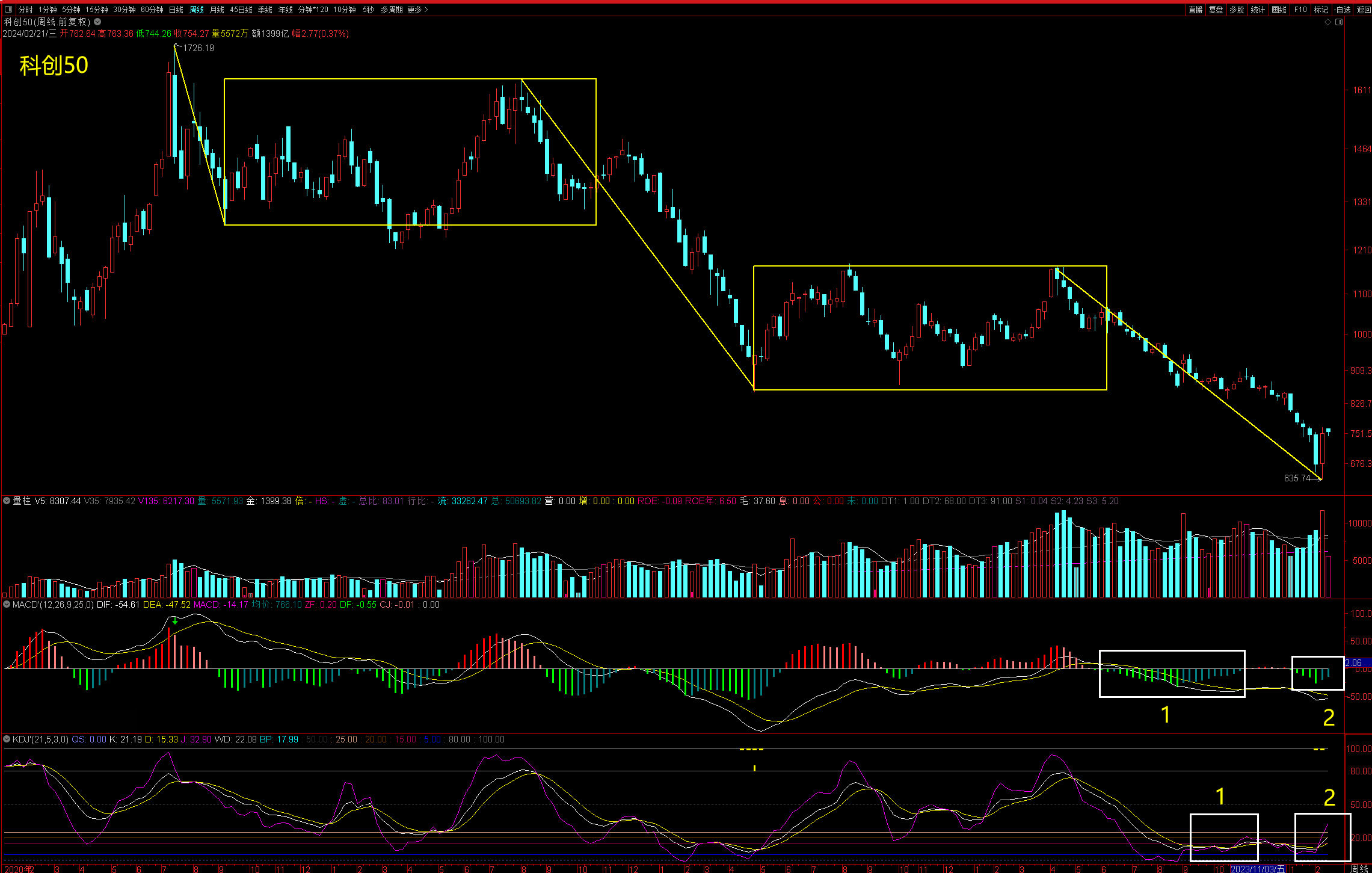 科创50这轮熊市暴跌63%,周线上走出了两中枢下跌,调整已经非常充分。周线上KDJ有形成双底金叉的倾向,第一个金叉是假金叉,对应着下跌中继;第二个金叉有较大概率是真金叉,对应着一波反弹。MACD的绿柱面积也明显缩小,说明后面2处对应的下跌力度弱于1处对应的下跌力度,技术面引发一波周线级别反弹的概率比较大。