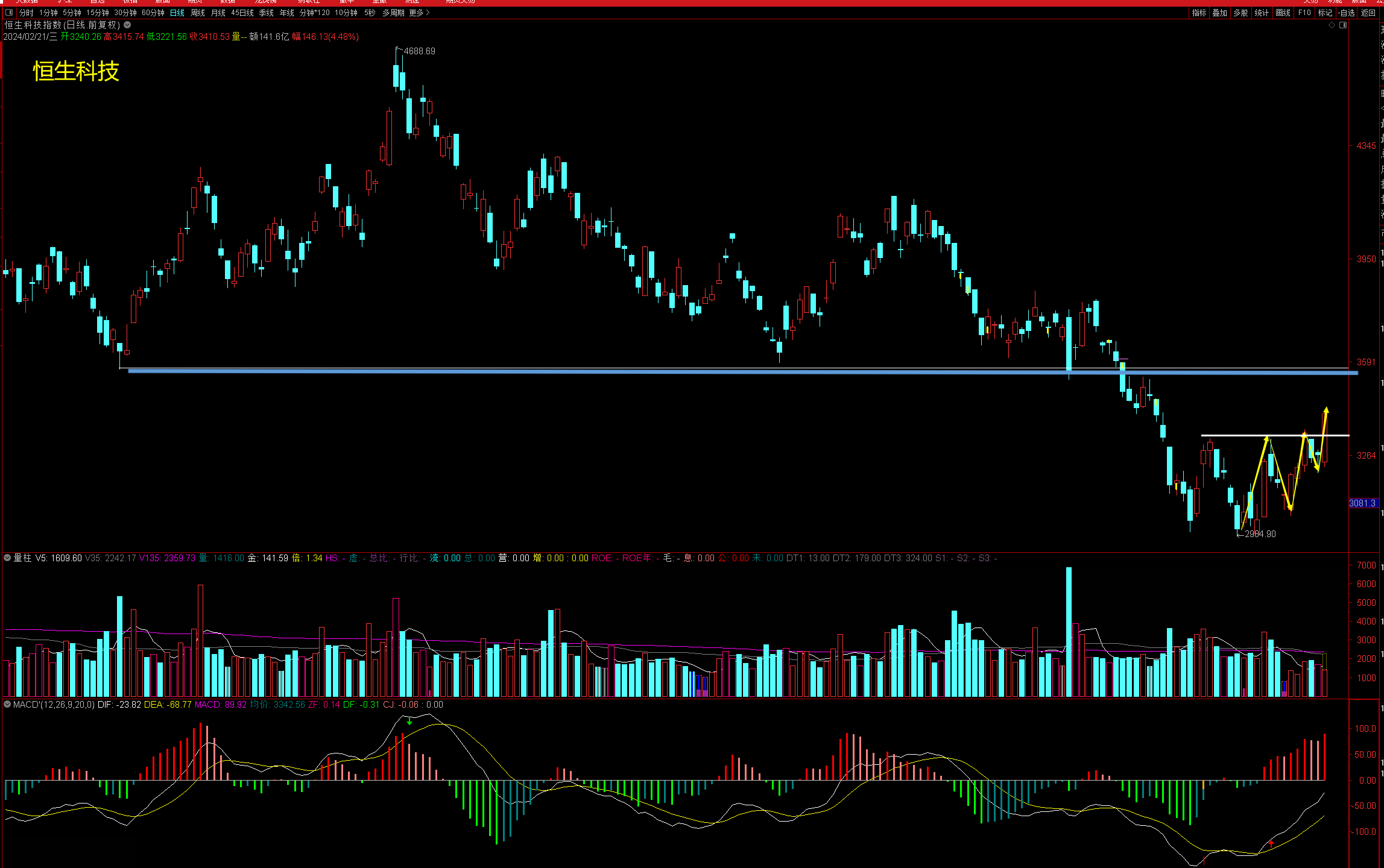 恒生科技以大涨方式突破白线处的小压力位,走势结构上走出了60分钟级别的中枢上涨趋势,后面大概率要冲击上方蓝线处的强压力位。如能突破并站稳蓝线,这波反弹有望演化为周线级别的上涨。