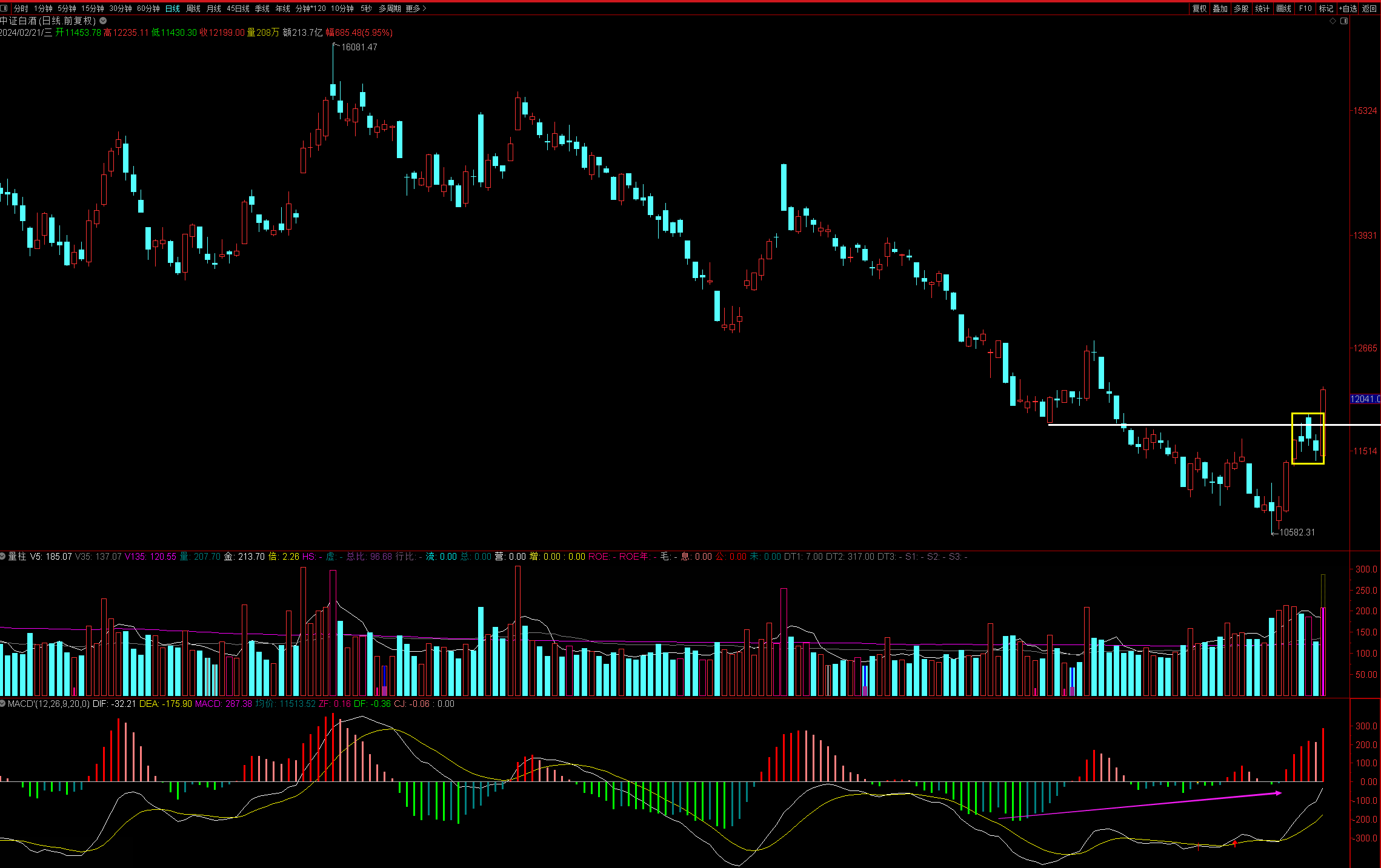 中证白酒日线上接连底背离,当时明确指出它有望走出一波反弹行情。今天放量大涨,一阳吞三阴,并突破了白线处的小压力位,反弹越走越强。后面只要守住本周二的低点,中线有望走一波行情来。