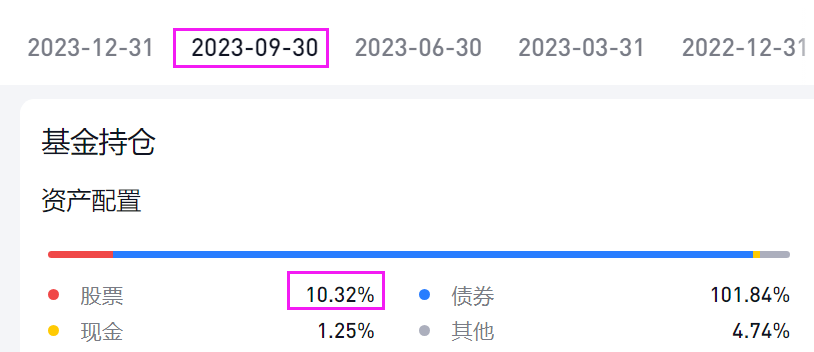 2021年一季度至2023年三季度,这期间股票持仓非常低,只有10%左右,大量仓位配置的是能带来稳健收益的债劵。
