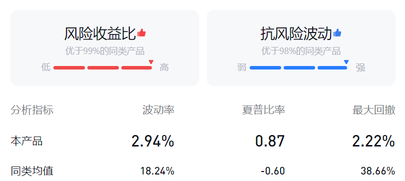 基金经理卓越的择时能力及以债劵为主的配置,使得这只产品回撤特别小。近3年来,最大回撤只有2.22%,同类产品平均回撤高达38.66%,沪深300回撤超40%。如果这3年来配置了这只基金,可以完美的躲过这轮熊市的大跌。