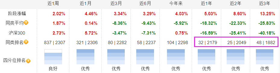 近3年、近2年、近1年、近6个月等各个时段均为正收益,且收益率大幅跑赢同类平均,市场排名相当高,综合表现超过98%的同类产品,不得不说这款擅于择时的基金表现很优秀。