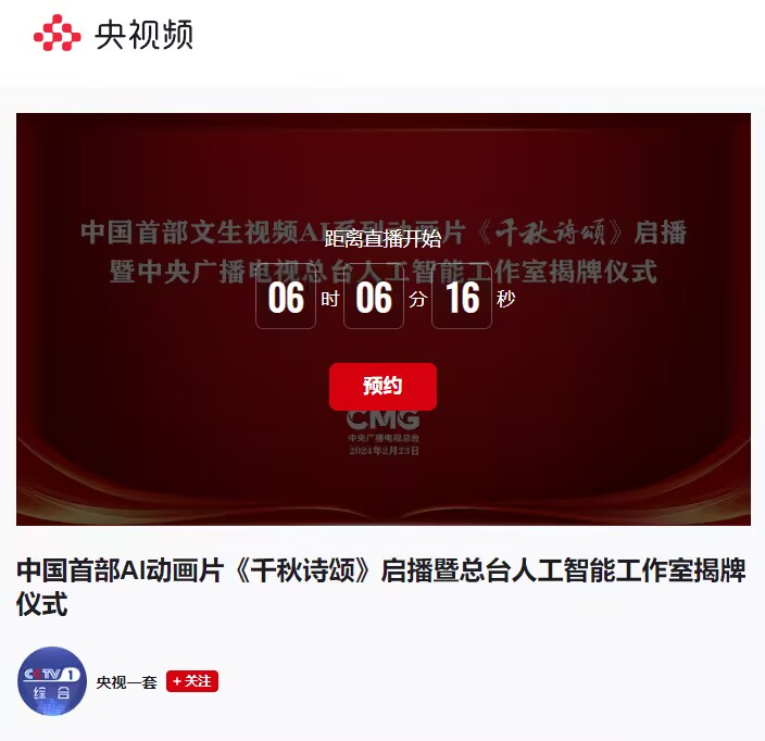 中国首部文生视频AI系列动画片《千秋诗颂》启播暨中央广播电视总台人工智能工作室揭牌仪式,2024年2月23日在京举行