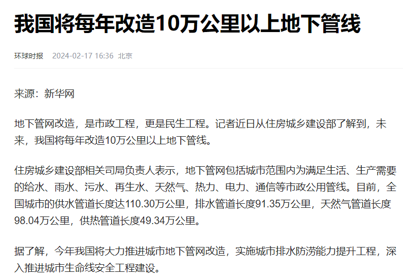 市场规模更大的,还有城市更新、城中村改造、住房升级,以及100万公里长度城市地下管网的更新。