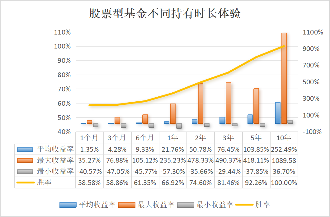 总结来说,在历史可统计的数据范围内,在任意时点买入股票型基金、偏股型基金或偏债型基金,持有时间越长,投资盈利的概率相对来说就越高。背后的原因在于,长期持有可以较大程度地规避市场短期的不确定性。