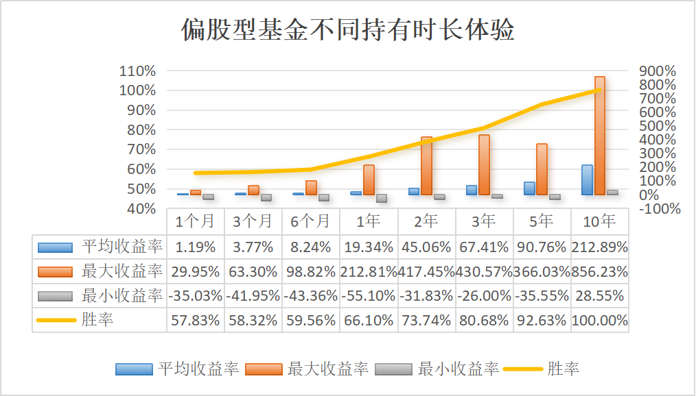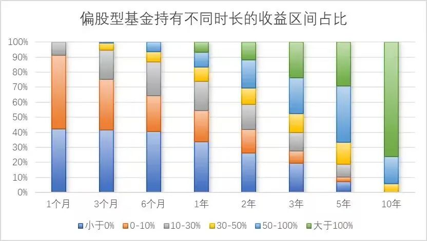 同样的规律也适用于偏股型基金。任意时点买入偏股型基金并持有6个月胜率仅为59.56%。但如果拉长持有5年的时间,胜率就能提高到92.63%。如果持有时间更长,达到10年之久,胜率可以达到100%。(过往业绩不代表未来)