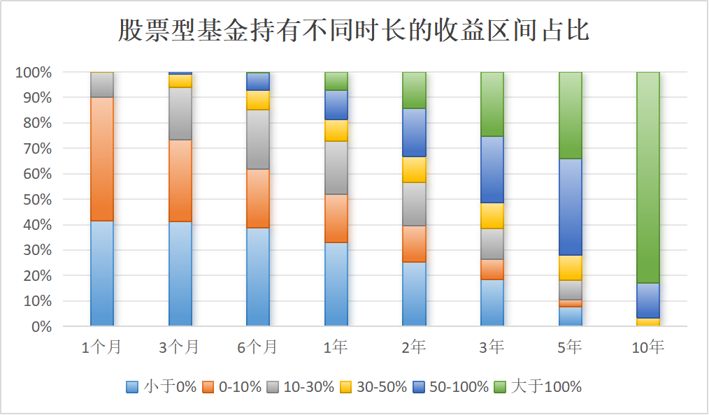 从收益率区间来看,任意时点买入股票型基金并持有3个月,有41.14%的概率收益为负,可以说这是非常高的比例了;但是如果持有5年,负收益的概率大幅降低至10%以下。可以看出,在长时间持有的情况下,基金投资者的体验感会得到改善。