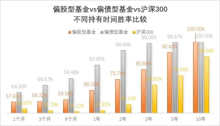 我们也进一步对比了偏股基金、偏债基金和沪深300指数的不同持有时间的胜率情况。可以看出来,不论是偏股基金还是偏债基金,不同时间的持有胜率都高于沪深300。