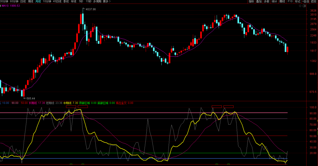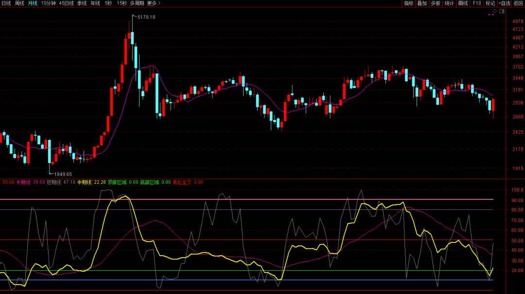 目前月线那牛指标(黄线)尚未到达底部,更未与红线金叉,而在以往的每一波行情中,那牛黄线都会到达底部。按波浪理论分析,本次调整的低点应该低于2018年低点,似乎调整尚不到位,所以目前连续大涨的可能性不是很大,仍有调整空间。