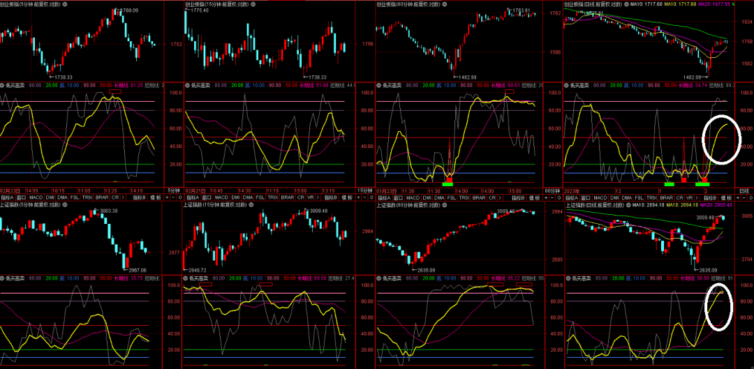 下图上排依次是创业板指的5分钟图、15分钟图、60分钟图、日线图。