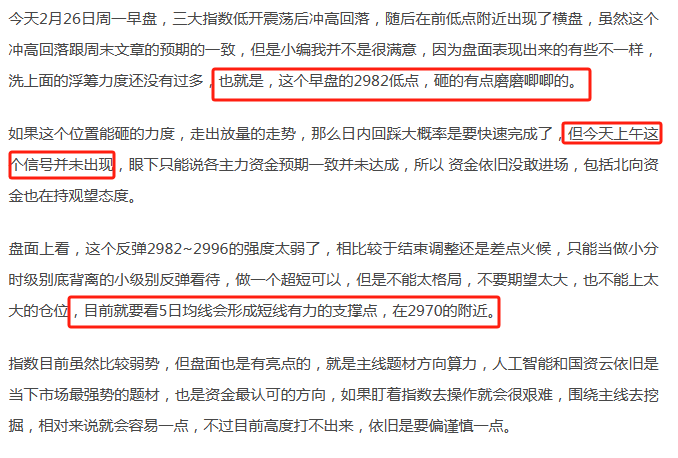 回顾图中所说午评的文章,我们来看,下午上证以2987开盘,13.42分钟回升至3003,此时让很多人认为行情开始要向上了,小编又怎么说的?是不是明确指出早盘的2982低点,砸的有点磨磨唧唧,更是扬言不要期望太大,也不能上太大的仓位,目前就要看5日均线会形成短线有力的支撑点,在2970的附近。