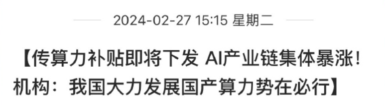 现在的小作文也没人管真伪了,能上涨都是好的。其实引爆今天算力板块大涨的不光是这种小作文,而是昨晚大饼和二饼暴涨所引起的。