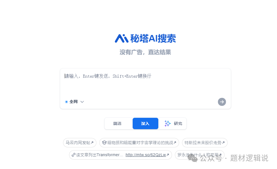秘塔AI搜索界面非常简洁,没有广告。在网页末端标有提示语:“内容由AI大模型生成,不能保证完全真实,请仔细甄别”。其主界面有简洁、深入、研究三个层面的选项,不同选项对应的回答深度不同,并有“全网”、“学术”两种模式切换,在回答右侧附有大纲,下方附有相关事件、组织和人物,并标明来源。