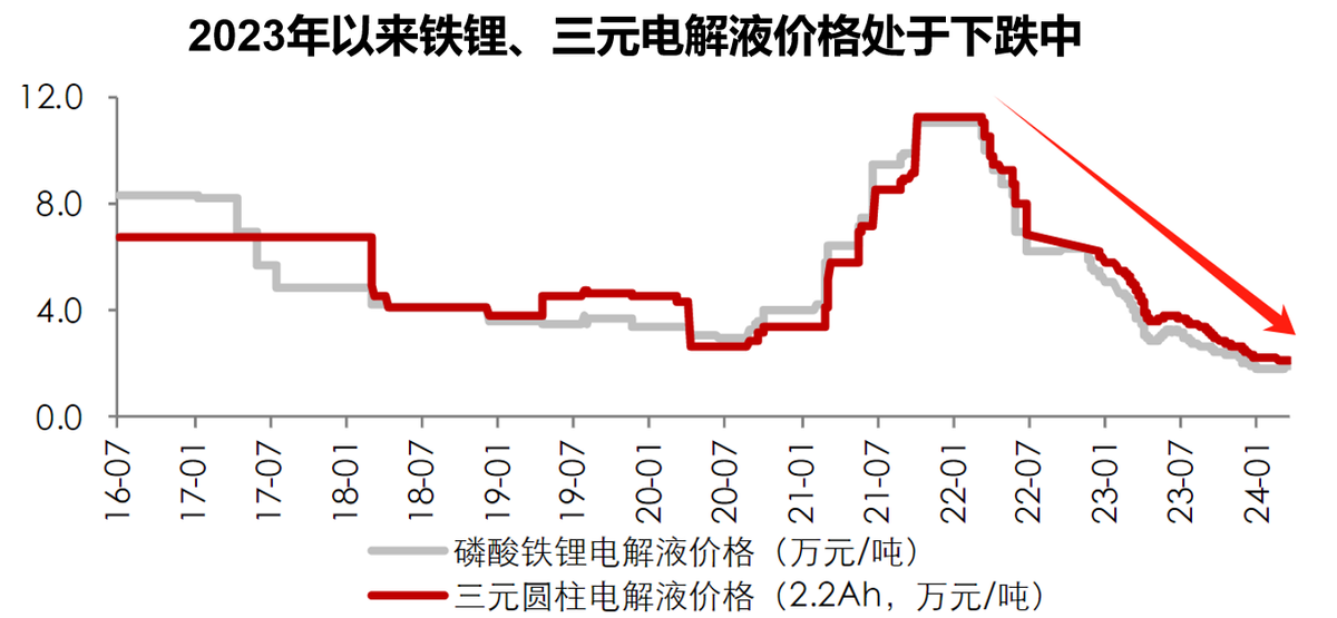 受新能源产业链供需关系的影响,2023年以来磷酸铁锂、三元电解液价格俯冲,磷酸铁锂电解液价格目前已不足2万元/吨,处于近年低位水平。