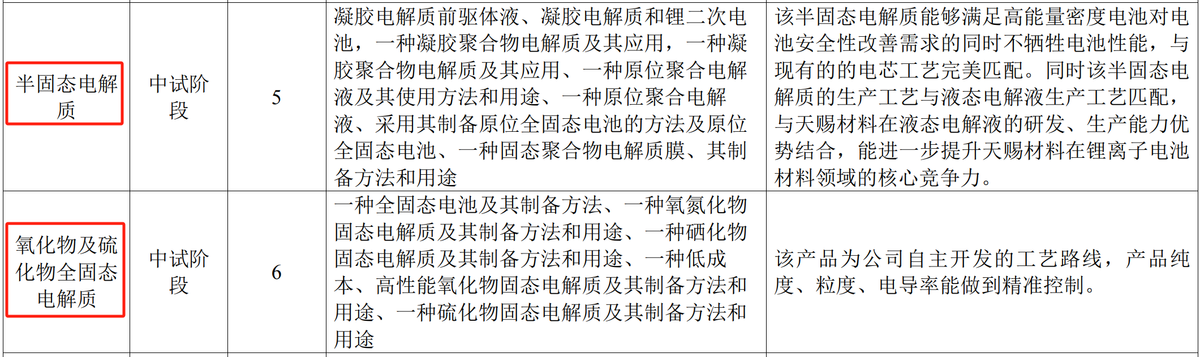 目前,公司半固态电解质、氧化物及硫化物全固态电解质均处于中试阶段,以应对固态电池时代到来。