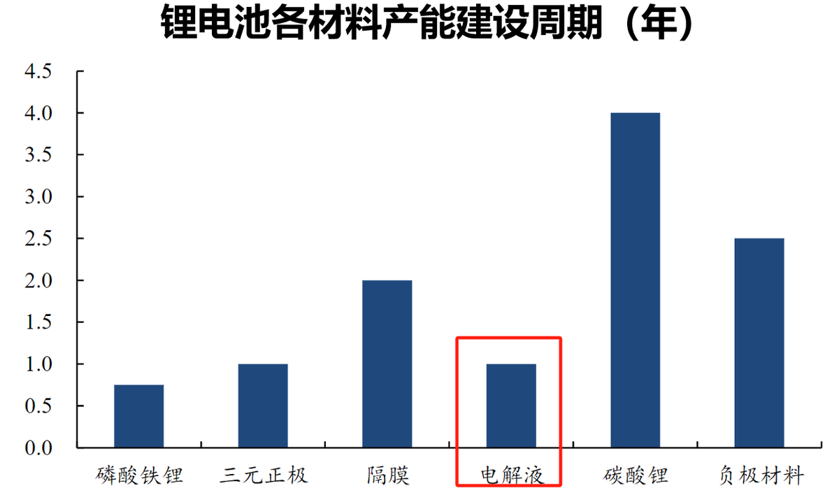 电解液虽然不是占成本比例最高的,但是因为它国产化程度高,以及独特的产能特性(建设周期只有一年左右),成了锂电池产业链上非常敏感的一环。