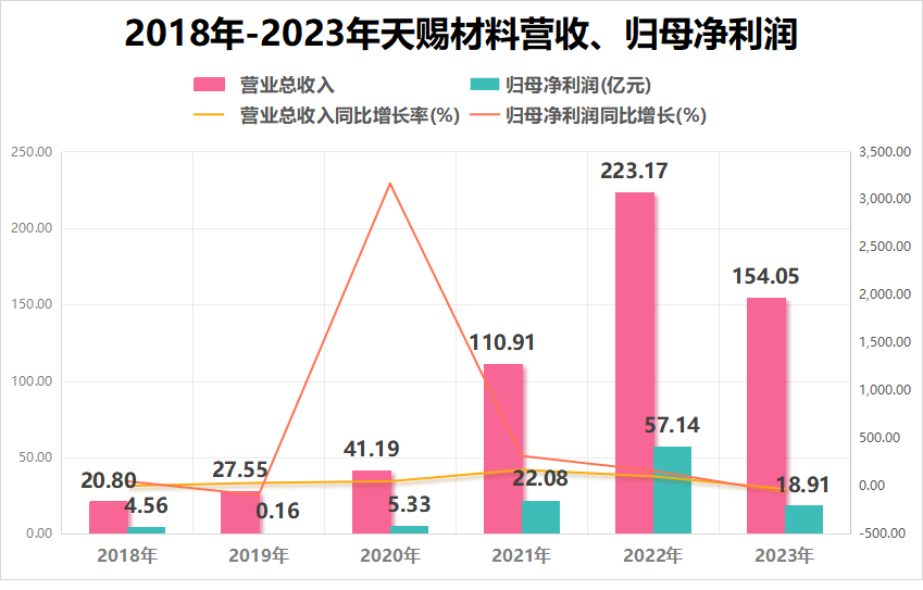 2023年天赐材料实现营业收入154.05亿元,同比下降30.97%;实现归母净利润18.91亿元,同比下降66.92%。