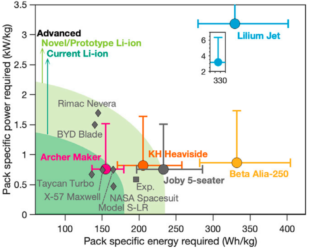 注:“Current Li-ion”代表已经大规模生产的电池技术,“Novel/prototype Li-ion”表示最近开发的或用于高性能应用电池技术,“Advanced”表示尚未商业化的新型电池技术;横坐标为能量密度,主要代表着航程需求,平行于横坐标的水平误差条表示在空重(等于最大起飞重量减去有效载荷和电池重量)占整机重量的比例在0.45-0.55时的估计值;纵坐标为功率密度,主要代表着起降需求,平行于纵坐标的误差条显示降落时的功率要求 资料来源:《The promise of energy-efficient battery-powered urban aircraft》(Shashank Sripad,2021),中金公司研究部