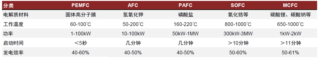 图表:氢燃料电池分类与性能对比