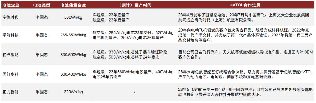 图表:电池企业固态/半固态电池布局及eVTOL合作进展
