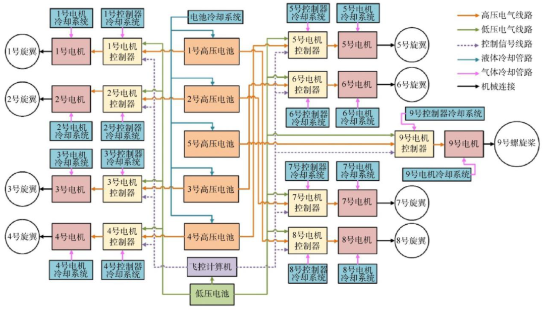 eVTOL的电驱动系统多采用分布式部署,以满足飞行器高冗余性和高安全性的严苛要求。这种分布式动力总成架构主要由高压电池、低压电池、飞行控制计算机(FCC)、电子调速器(ESC)、部件冷却系统、线缆、管路、电机和旋翼/螺旋桨组成。动力总成主要被分为两大功能模块,1)储能模块由高压电池和低压电池组成,承担能量存储功能、2)能量转化模块由ESC和电机构成,负责将储能模块中的能量转化为机械能。此外,每个电机和每个 ESC 对应着一套独立工作的冷却系统,所有高压电池共用一套液体冷却系统。