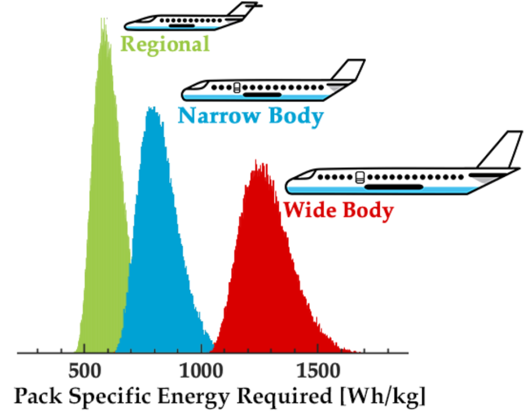 注:Regional区域飞机航程500海里(926公里),载客量30-75人,Narrow窄体客机飞行航程1000海里(1852公里),载客量在区域飞机和宽体飞机之间,Wide宽体飞机续航大于2000海里(3704公里),载客量200-400人 资料来源:《Performance Metrics Required of Next Generation Batteries to Electrify Commercial Aircraft》(Alexander Bills,2020),中金公司研究部