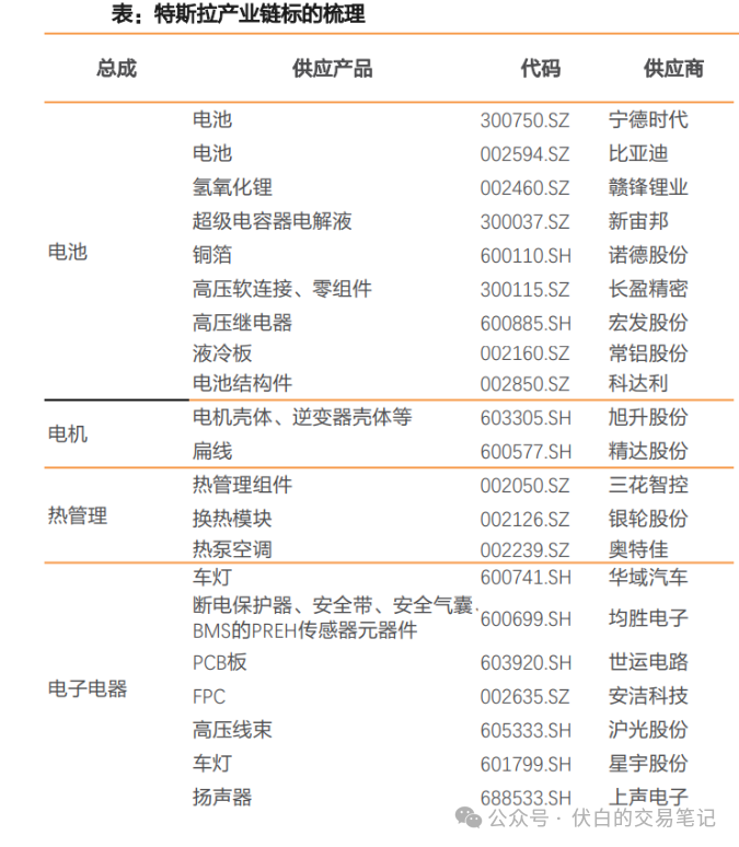 特斯拉当前主要路线为:附加值较高的核心环节自研自制,其他传统零部件外包为主。