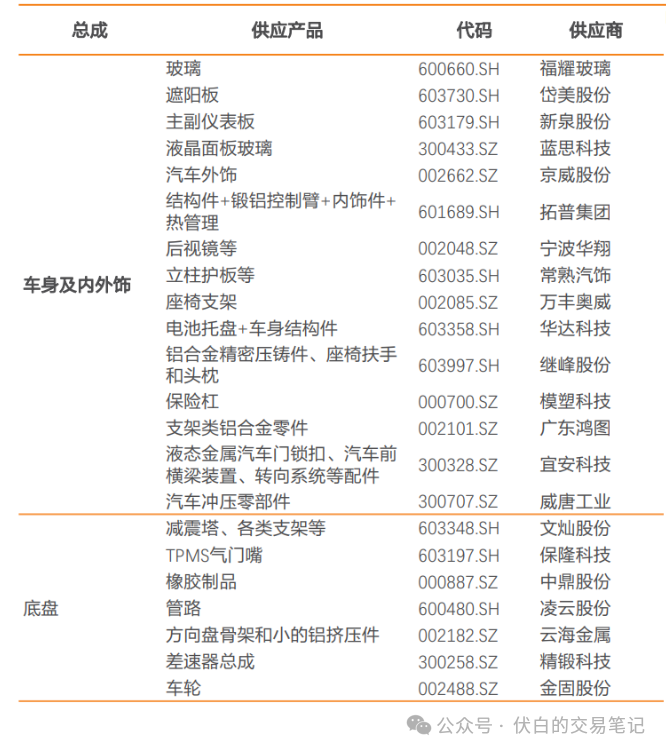 (4)车身及内外饰:宁波华翔、常熟汽饰、威唐工业、新泉股份、福耀玻璃、蓝思科技。