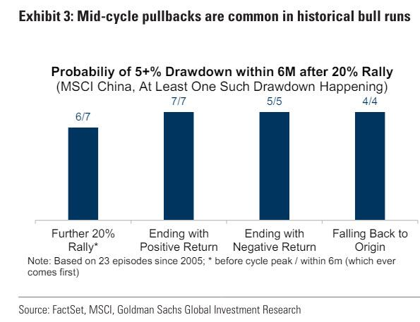对于高盛(Goldman Sachs)的策略师来说,在自2月份低点以来出现两位数的涨幅之后,这种回落并不特别令人意外。他们指出,MSCI中国指数在达到技术性牛市(即从底部反弹20%)后,在大约20个交易日内几乎不可避免地会下跌至少5%。