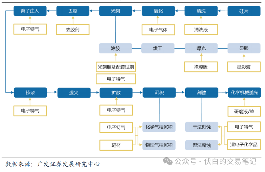 (1)制造材料:硅片、掩模版、光刻胶、湿电子化学品、抛光材料、电子特气、靶材七大类。