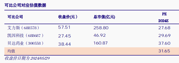 横向对比,我们选取同样处于核心产品快速放量阶段的艾力斯、凯因科技这两家科创板药企以及贝达药业作为可比公司,2024年可比公司平均PE约为31倍。