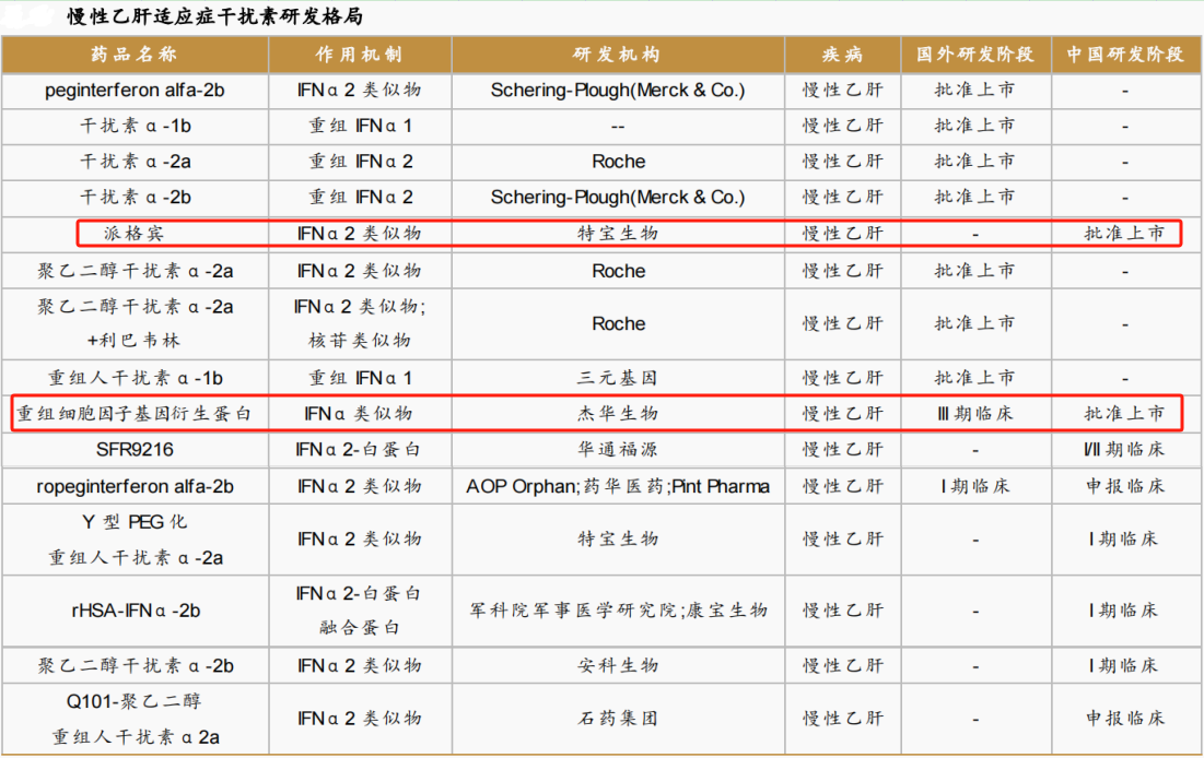 目前国内慢性乙肝适应症干扰素只有派格宾与杰华生物的重组细胞因子基因衍生蛋白,其余药企产品皆处研发之中。