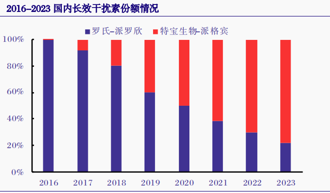 其中,佩乐能在我国已经停产,而派罗欣也在2022年10月正式退出中国市场,目前国内长效干扰素市场已基本由派格宾占据,2023年派格宾市占率超80%。