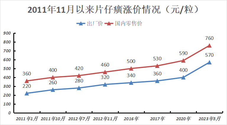 要知道,自2011年始,片仔癀已涨价8次,2023年5月产品零售价达760元/粒。