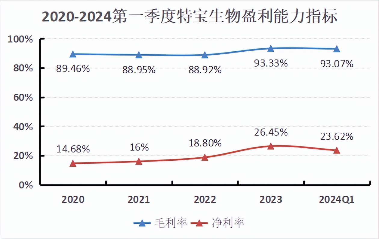 2020-2024Q1,特宝生物的毛利率波动上升,其中,2023年该指标高达93.33%,比上市公司的盈利标杆茅台还要高。