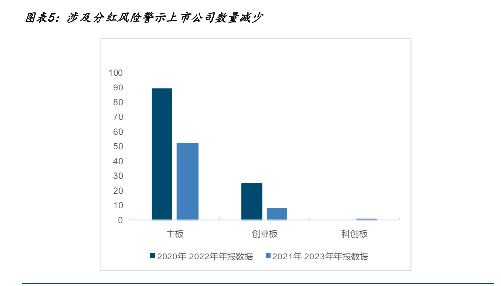 基于披露的2020年至2022年年报数据,触及分红风险警示的企业数量为114家,包括主板89家,双创板块25家,但当结合最新披露的2023年年报数据,触及该指标的企业数量则降低至61家,说明越来越多的上市公司开始在今年提升分红比例以规避未来ST风险,上市公司分红主动性明显提升,投资者获得感逐渐增强。