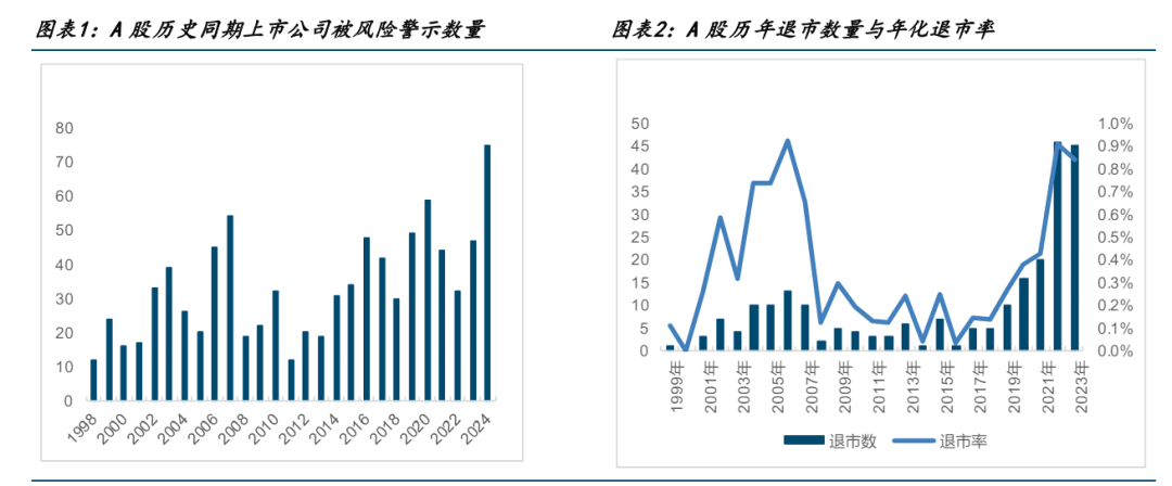 据国金证券统计,截至2024年5月底,A股已有9家上市公司完成退市,被退市风险警示(*ST)和其他风险警示(ST)的企业数量达到75家,创历史同期新高,表明市场对绩差企业的出清力度进一步加强。随着退市新规的落地实施,强制退市的企业数量有望迎来新高,年化退市率或将突破1%,退市新规的效果开始显现。