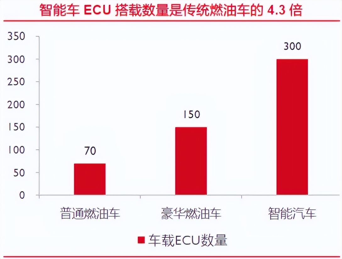 传统普通燃油车携带ECU(由MCU、存储器、传感器、输入/输出接口等集成电路组成的电子控制单元)约为70个,豪华燃油车ECU约为150个。