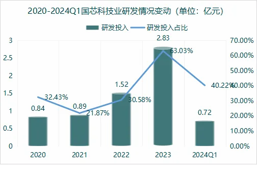 近年来国芯科技研发占比急剧攀升,2023年达到63%,远远超越了同行,要知道半导体企业的研发占比超过30%的都不多。