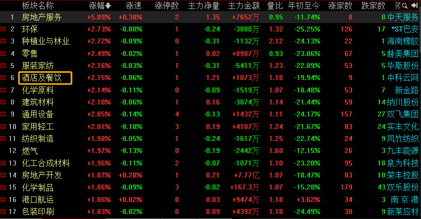 盘面上,房地产服务、环保、种植业与林业、零售、服装家纺、酒店及餐饮等板块涨超2%。在这些强势板块中,酒店及餐饮板块值得关注,毕竟随着高考结束,小学、初中也将迎来毕业考试,旅游旺季将拉开序幕。