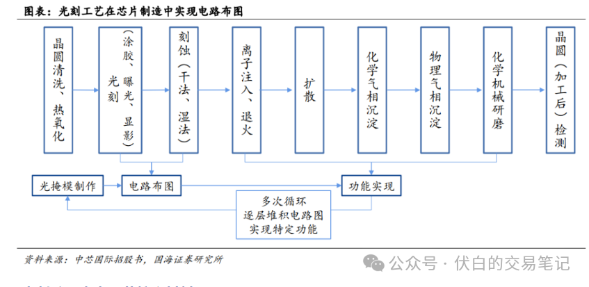 通过光刻和刻蚀工艺将电路图转移到晶圆上后,再进行离子注入、退火、扩散、气相沉积等流程,最终在晶圆上实现集成电路结构。