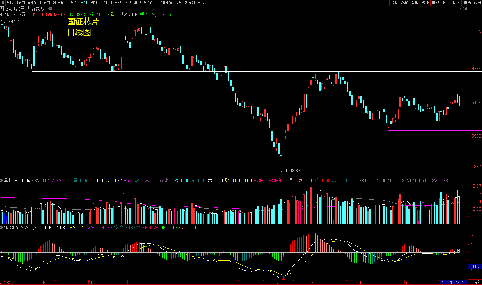 国证芯片这轮熊市大跌64%,调整是非常充分的。今年2月份的低点,大有可能是历史性低点。白线处是个强压力,紫线处是个支撑位,中线来看,在紫线与白线之间维持震荡的可能偏大,需要通过震荡来消化上方压力。