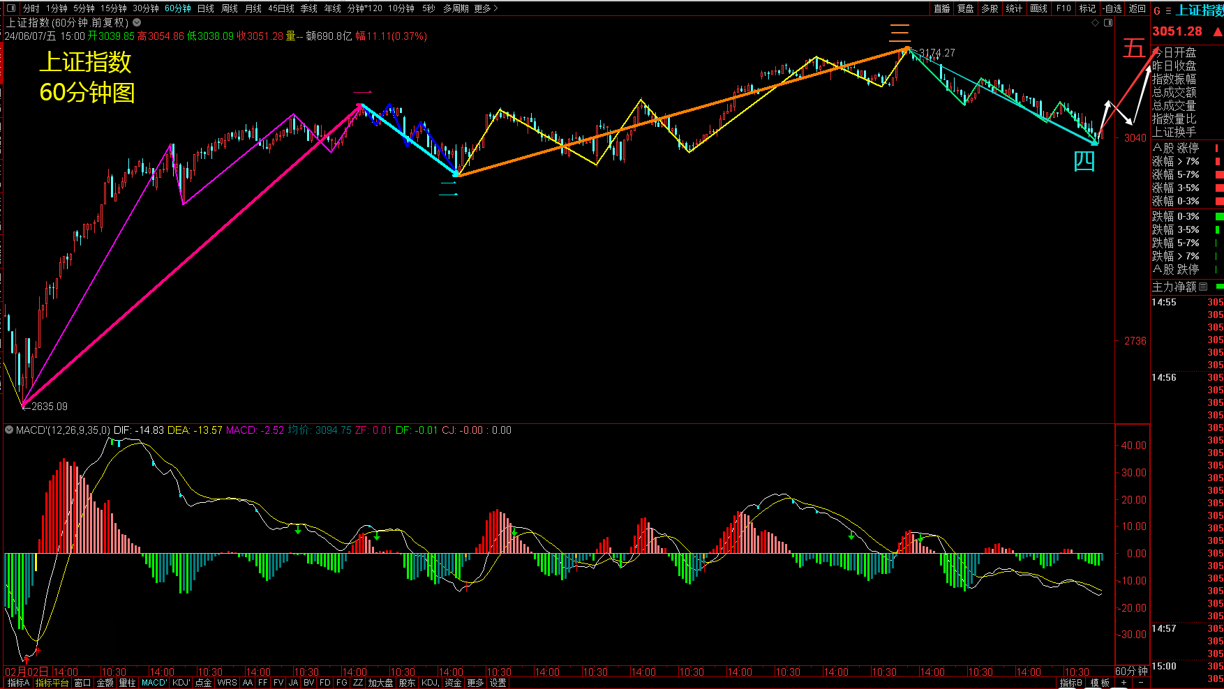上证指数这副图老朋友一看就知道。股指刚刚调整时黑马就提出过:以小5浪方式进行四浪回调。现在来看,指数已经走出了小5浪的调整,会不会延伸为小7浪,下周见分晓。
