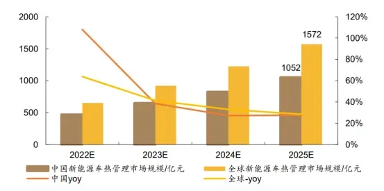 所以,在新能源加速放量以及热管理系统价值量提升下,预计到2025年,我国汽车热管理市场规模将达到1000亿元,全球市场规模会超过1500亿元。