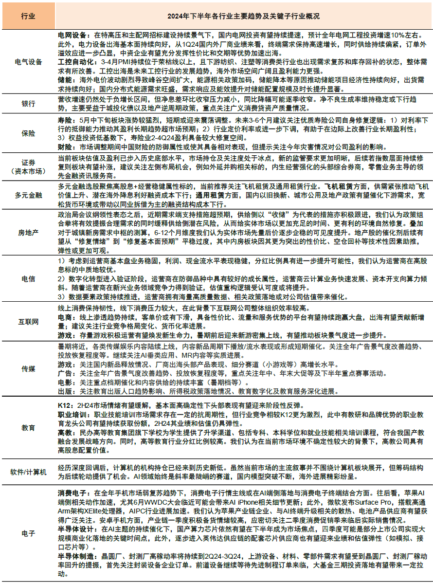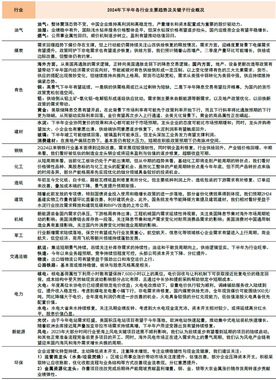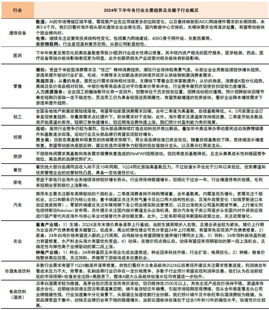 2024年下半年行业配置关注点